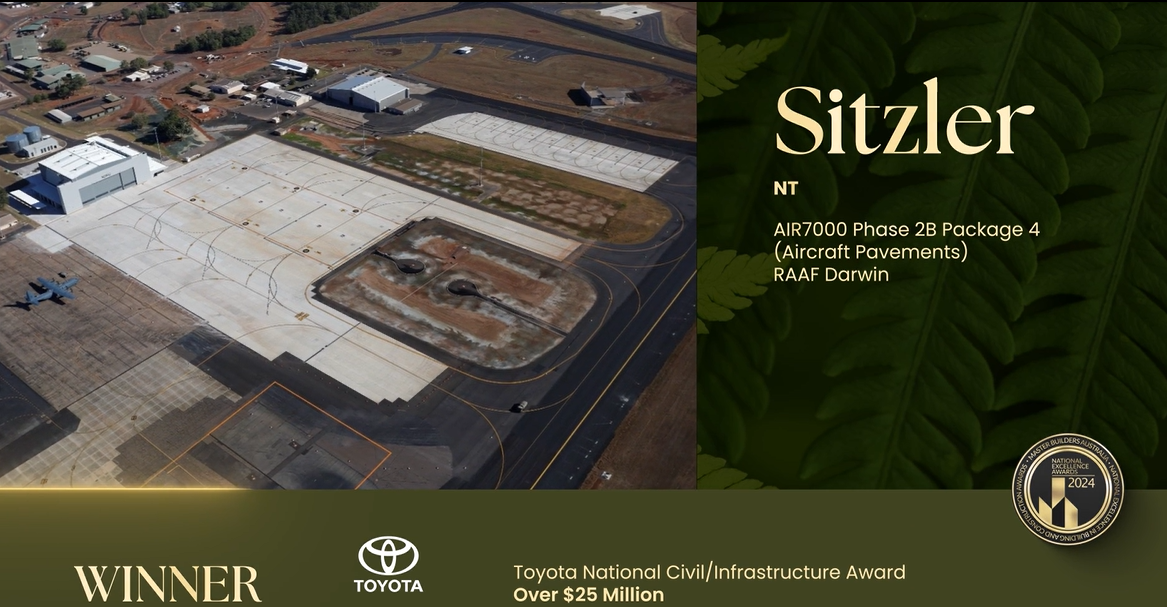 Sitzler wins the Toyota Motor Corporation Australia National Civil/Infrastructure Award over $25 million at the 2024 Master Builders Australia National Excellence in Building and Construction Awards for the AIR7000 Phase 2B Package 4 (Aircraft Pavements) RAAF Darwin.